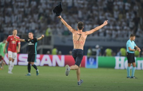 Големите мачове често имат неканени гости. Така беше и на Суперкупата на Европа, когато на терена на скопския стадион "Филип Втори" в самия финал на дуела между Реал и Манчестър Юнайтед (2:1) - влезе запалянко.