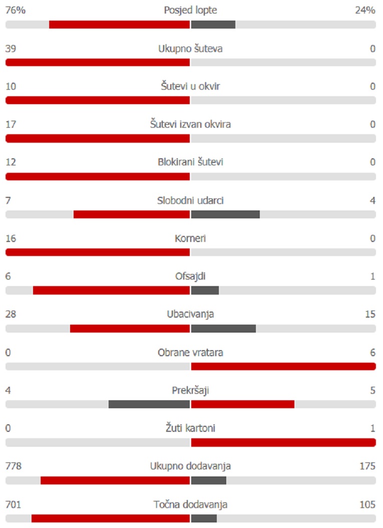 Македонците вчера в последния кръг на Лигата на нациите забиха четири гола, но на никого не е ясно как не вкараха още толкова, а дори и десет гола, защото бяха толкова доминиращи. Съставът на Игор Ангеловски отправи чак 39 удара към вратата от които десет бяха в очертанията на вратата, като изпълниха и 16 корнера. Македонците са имали 76% владение на топката и 701 точни подавания, чак седем пъти повече от противника. До 67-ата минута резултатът беше само 1:0, а тогава македонците в края забиха още три попадения.